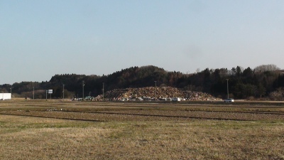 宇部町中野製材所跡地に集められた瓦礫。瓦礫と言っても村民の生活の想い出が詰まったものばかり。無念の山なのである。 |