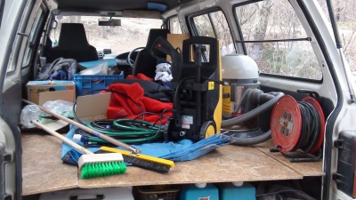 いつ何時でも野田に向かえるよう、七つならぬ五つ道具を車に積みっぱなしにしている。泥を掃き出す自在箒、デッキブラシ、掃除機、ドラムリール、そしてこのために買った高圧洗浄機。 |