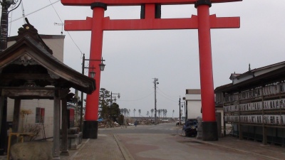 愛宕山の方から鳥居の向こう側、ついこの間まで野田村の商店街が並んでいた目抜き通りを見る。 |