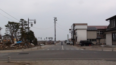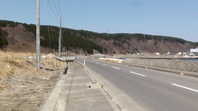 堤防も壊れている所が数ヶ所あった。野田十府ヶ浦の堤防は引き波で壊れたが、ここでは押し波で壊れている。道路も何ヶ所か舗装の剥がれていたが、震災後1ヶ月が過ぎ路上の瓦礫や泥はきれいに片付けられていた。 |