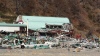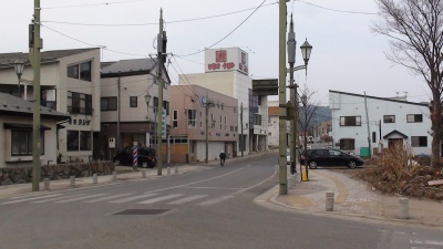 上の写真の通りに直交する商店街。瓦礫の山だったが、今はすっかり片付けられている。営業しているのは手前の理容室だけで、その向こうの伊東薬局、文具の中健、呉服の中伊、野田村唯一のスーパー・マミーストアも瓦礫で店内が破壊されて閉鎖中。マミーストアは辛うじてプレハブの仮店舗を建てて営業していた。通りの右側はほとんど全壊状態。 |
