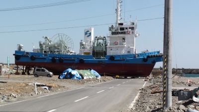 備蓄基地の船。道路をふさいでいるということは、津波で流されてきたもの。 |