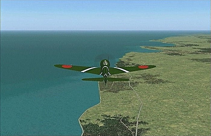 久慈では、夏井上空で思い切り降下して小袖海岸を低空で駆け抜け、野田湾を旋回して玉川付近に着陸。本当はここは平坦な場所ではないのだが、シミュレーション上では草地になっている。野田港の北西側には国道が直線になっている所が実際にあって、戦時中に滑走路を作る計画があったそうだ。シミュレーション画像でも見えたが、国道の往来を止めては申し訳ない(網走の原生花園の国道とは交通量が違う)ので、玉川草地(?)に降ろすことにした。