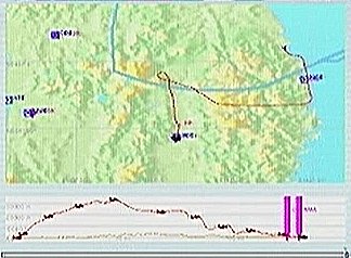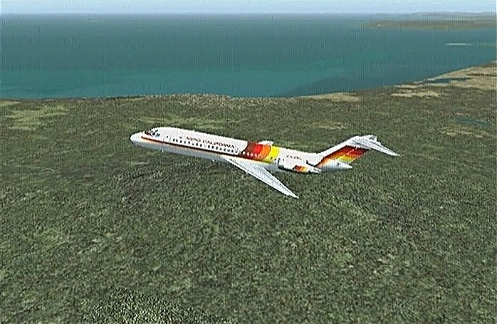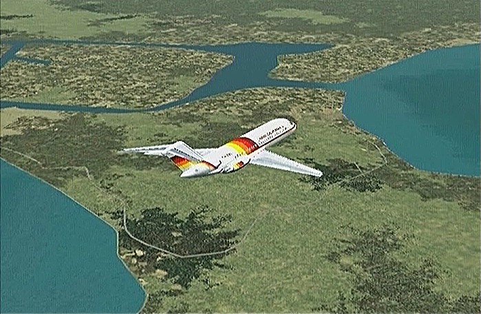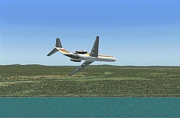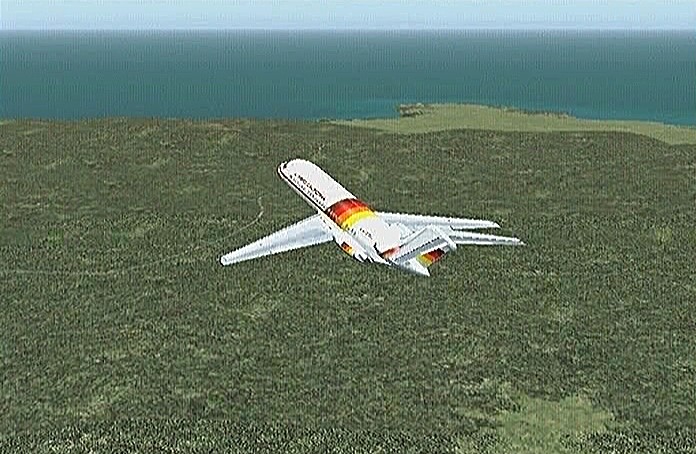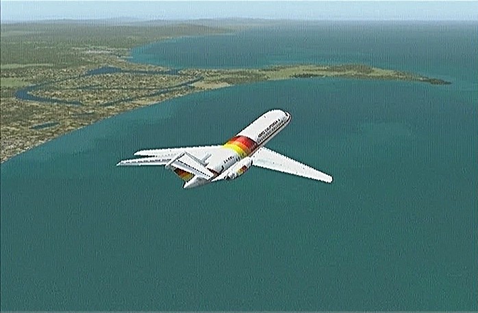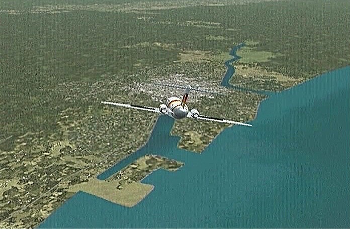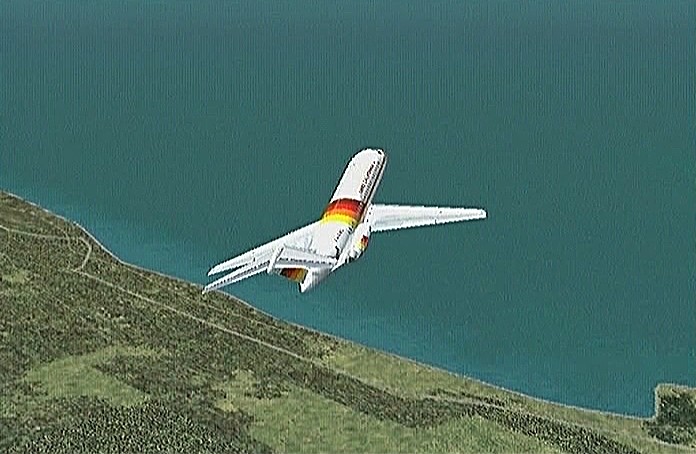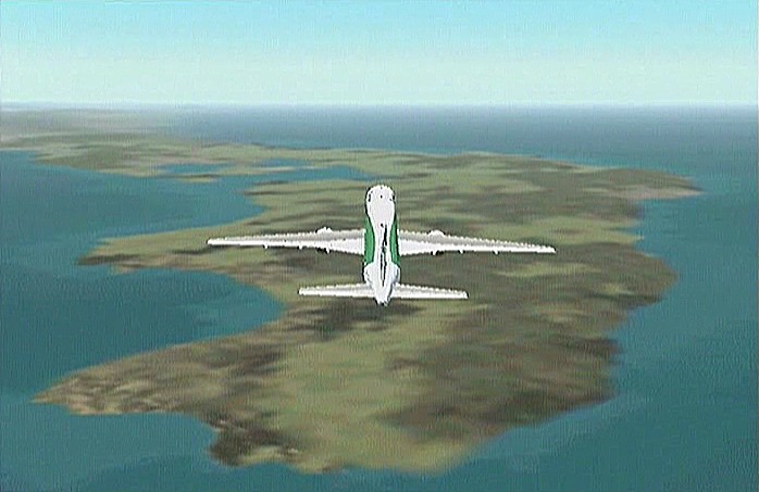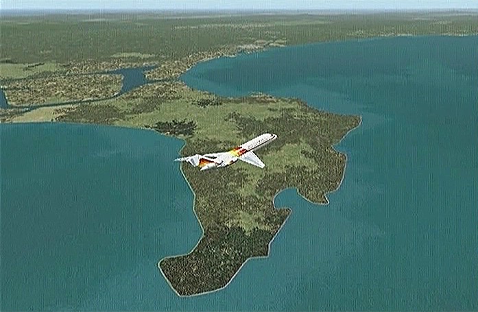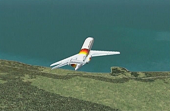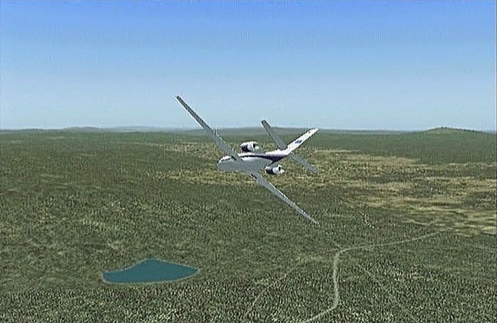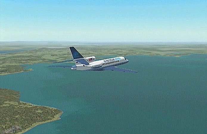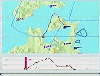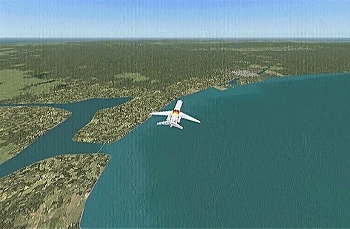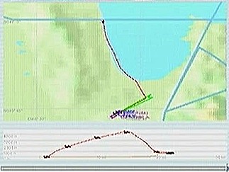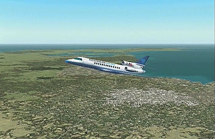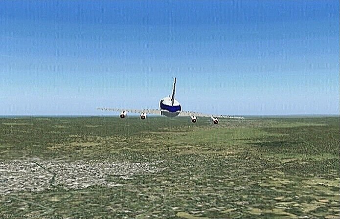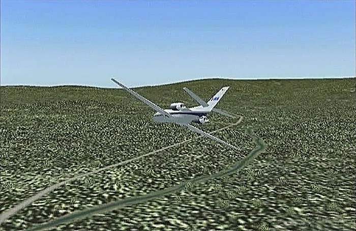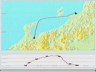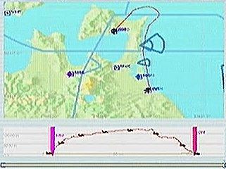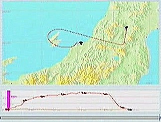 その後30%くらいのパワーで水平飛行させたが、それでもじきにコントレールを引く高度(6,000mくらい)に達してしまった。すでに八戸近くまで来ていたので、パワーをゼロまで落として静かに滑空降下させ、八戸沖を大きく旋回して進入。着陸は、今までの訓練中で一番うまくいった。ただ自分の場合、滑走路に向って降りて行く時にどうも真直ぐ入って行けず、接地もセンターラインをはずすのが常である。無風設定でやっているのだから、もっと機体の水平を保つ事に神経を払わねばならないと思う。