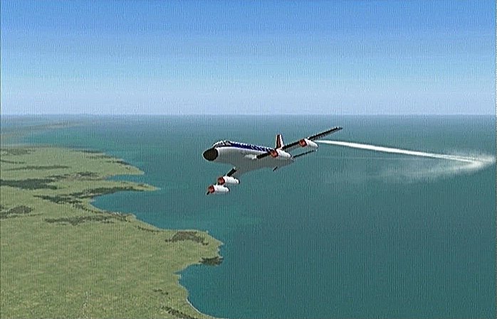 亜音速機が音速近くまでスピードが出てしまうと、一部に生じた衝撃波によって翼中央部で流れがはがれてしまい、翼後縁部にある舵が効かなくなってしまう。この状態を”衝撃失速”と言って、イギリスで初の超音速飛行にダイブで挑んだパイロットが振動する昇降舵を必死に引いたが機首は上がらず墜落。何度目かの挑戦でええいままよと操縦桿を押してスピードを上げたらようやく音速を超え、衝撃波が翼後縁部まで下がって舵が効くようになって機首が上がり生還することができた、という話は映画にもなった。バルカンの場合はまっさかさまになっても舵面の振動は収まらず、訓練中エレベータもエルロンも効かないまま何度か墜落させてしまった。離昇中もフルパワーだと70〜80度くらいの角度で上げないと、エレベータがまず振動し始めてオーバースピードの表示が出る。今回のフライトでも、出してしまった。パワーを絞って60度くらいの角度で上昇させたが、今度は失速の表示。実はコクピット・ビューで各メータが表示されてないので飛行中は速度を知る手立てがなく、失速を待つしかなかったのだ。まあ舵面を壊すより、失速はおとなしい機体なのだから失速させた方が無難だろう。実際、バルカンの失速は実に静かなものらしい。