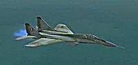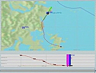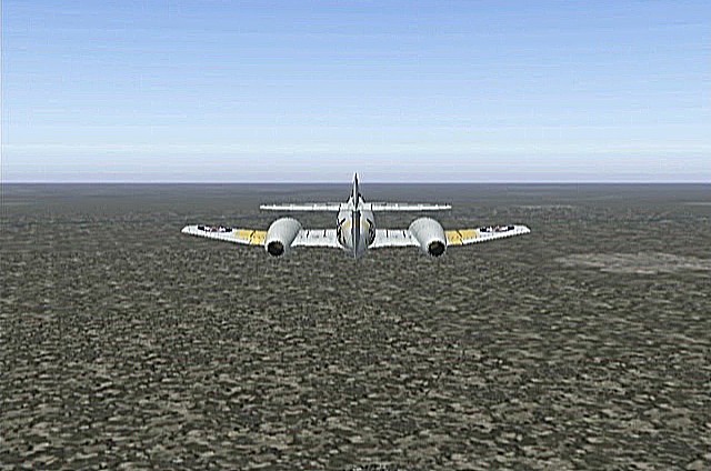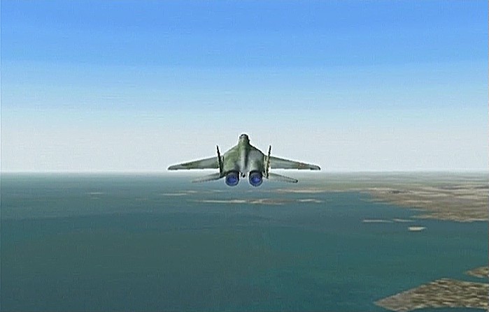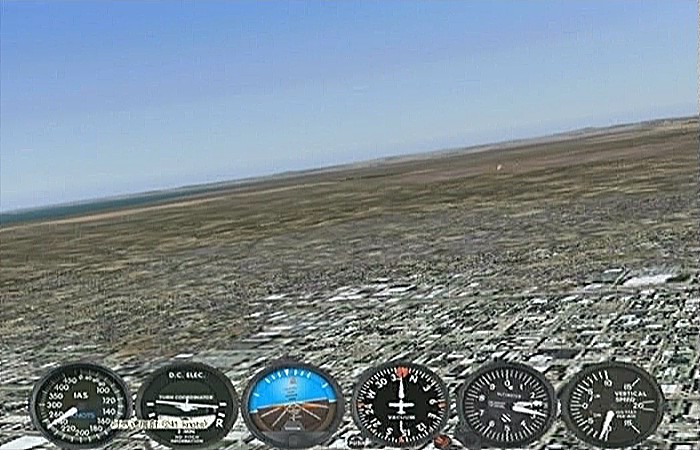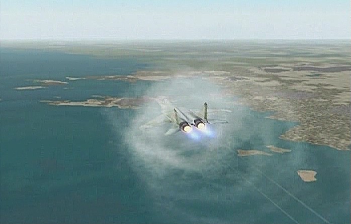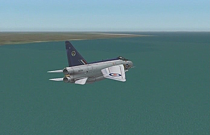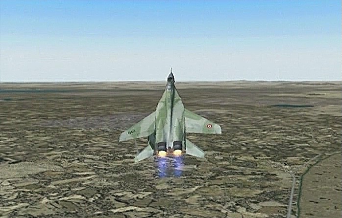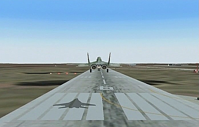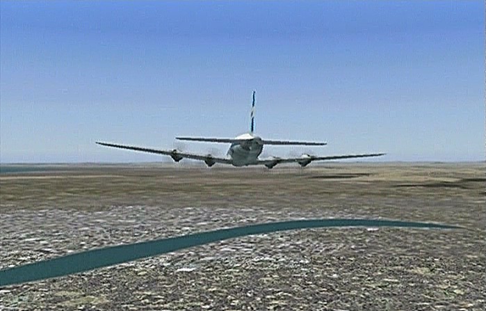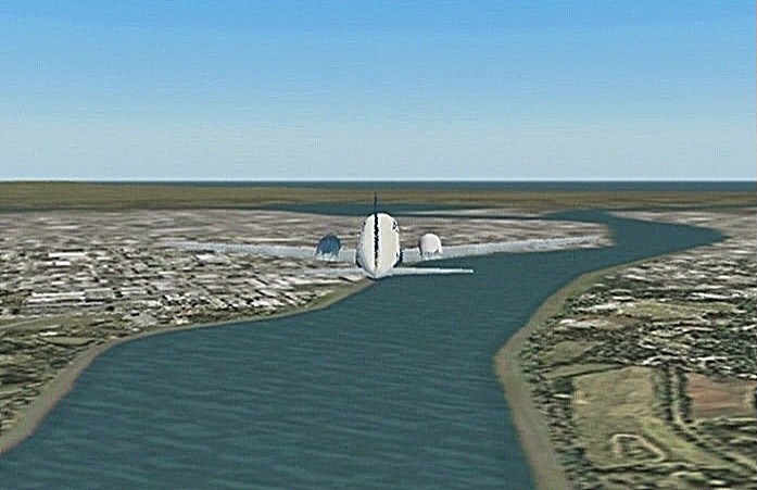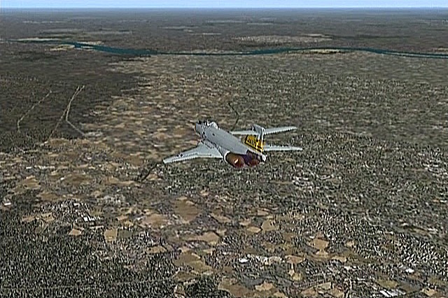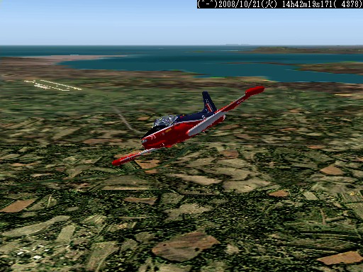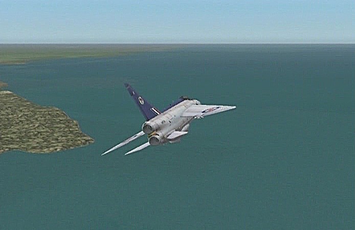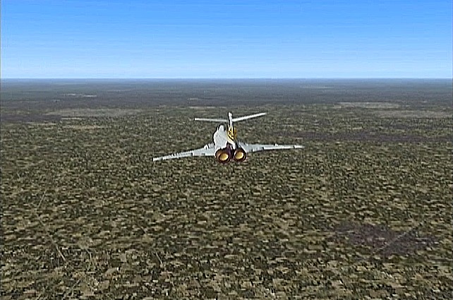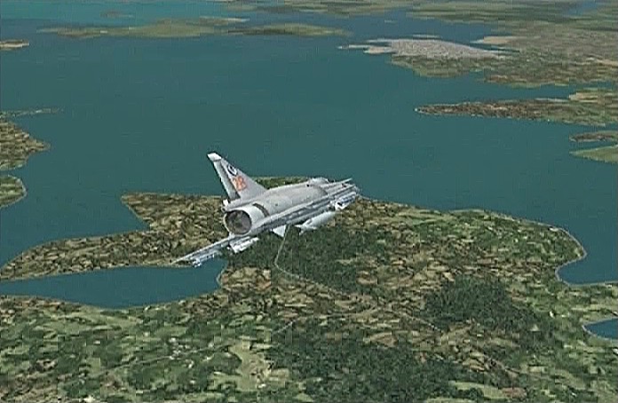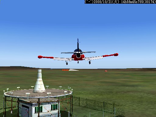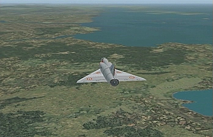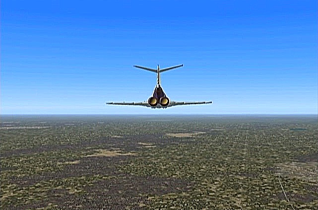 距離があるのでスピードの出る機体、昔から大好きだったB−58ハスラーを使いたかったが、着陸がむずかしく訓練が必要なため、今回は比較的容易に飛ばせるミラージュを使うことにした。軍用機は進入速度が速く、ちょっと速いだけでオーバーランしてしまう。進入中の速度と高度を細かくチェックするため、コクピット・ビューにした。(本来はこちらでやるべきなのだが、せっかくだから飛んでいる機体を見ながら飛ばしたいということでスポット撮影機ビューにしている。)最後は少々ドン着ぎみだった。