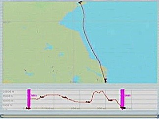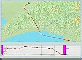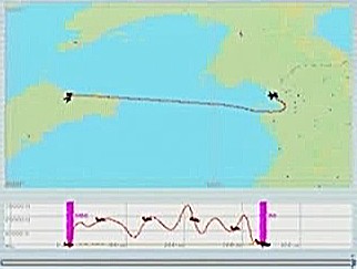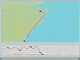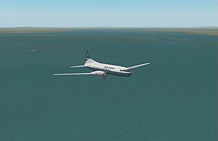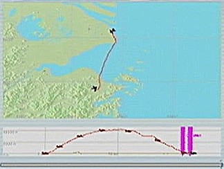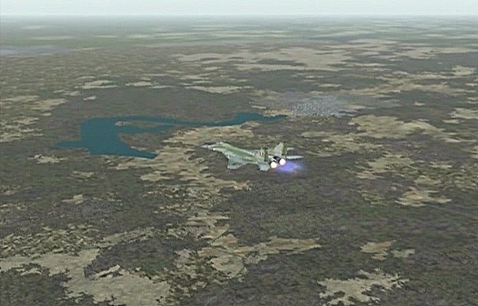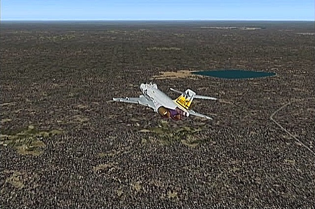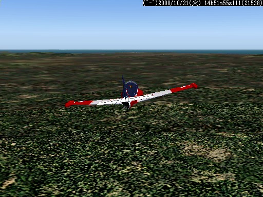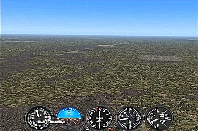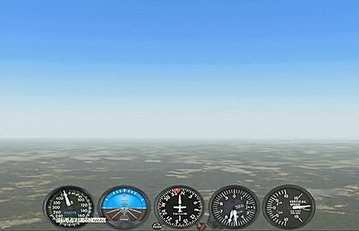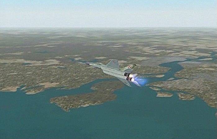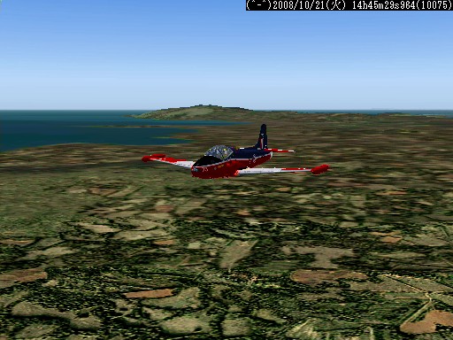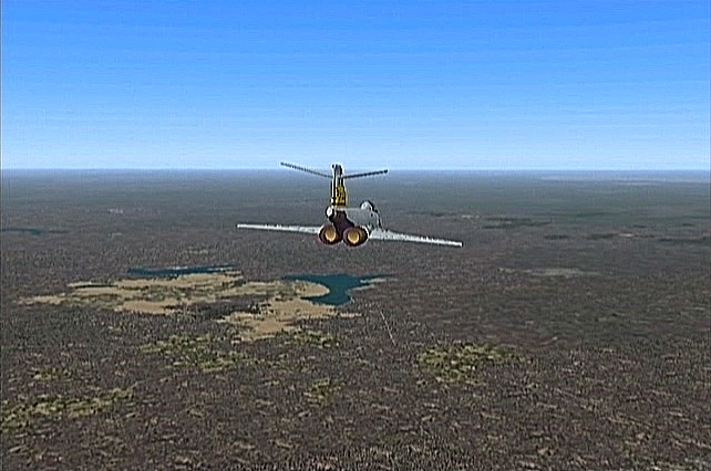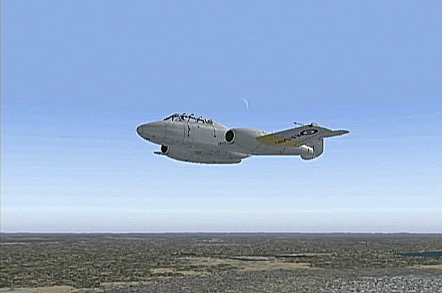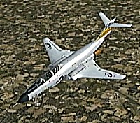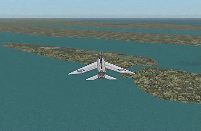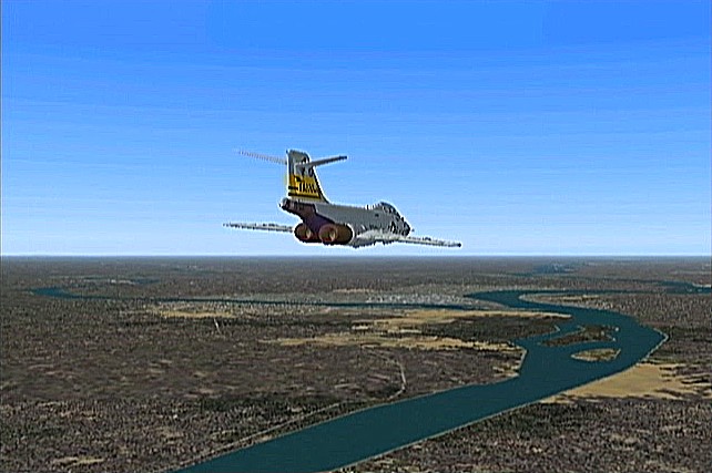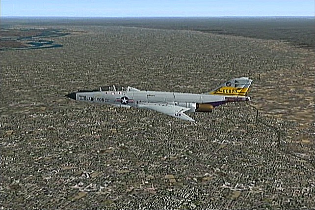 距離があるので、速度が1,500km/h以上出る機体としてF−101を選択。ところがこのF−101は舵が効きすぎて着陸が難しく、3舵の感度を半分にした。ソフトウェアによって異なるだろうが、FS2004では「感度を落とす」とはスティックを操作してから効き始めるまでの応答が鈍くなるだけで、舵の可動範囲が小さくなるわけではない。あるジョイスティック・メーカーの専用ソフトでは、「応答時間」ではなく「可動範囲」の設定になっていた。本当はこちらの設定をしたかったのだが止むを得ない。何度か着陸訓練で慣らす。結局暴れながらも何とか降ろすことには成功した。