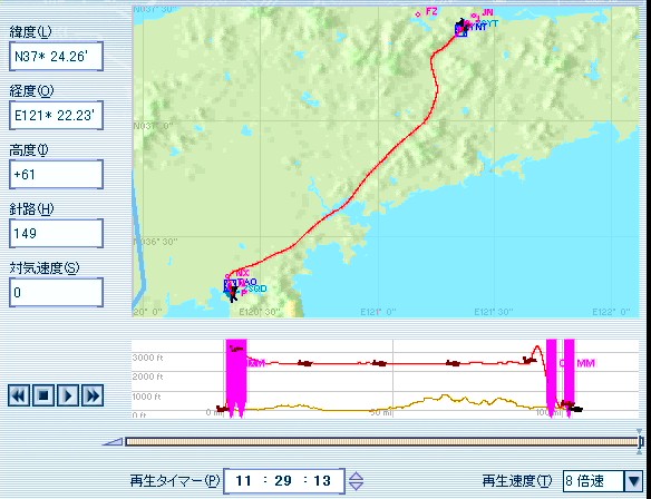 大陸のシム・フライトは、山を目標にはできない。実物と違って立体感がないため、高空からだと地表の凹凸は全くわからない。高い山でも、上から見下ろすと遠い山はほとんど判別不能である。幸いなことに長春へのコースに沿って湖が点々とあるので、これを目標にコース取りをすることにした。小さい湖は世界地図などには載っておらず、何度かコースを飛んでみて覚えた。1つ目の湖ははるか左を通り、2つ目の湖を目指す。3つ目の湖で左へ旋回して降下を始め、4つ目の湖の外側を大きく右へ旋回すれば丁度滑走路への進入コースに入れる。練習通りのフライトができた。なるほど、洋上フライトは島を目安に、大陸フライトは逆に水溜りを目安にすれば良いわけだ。ナットク。