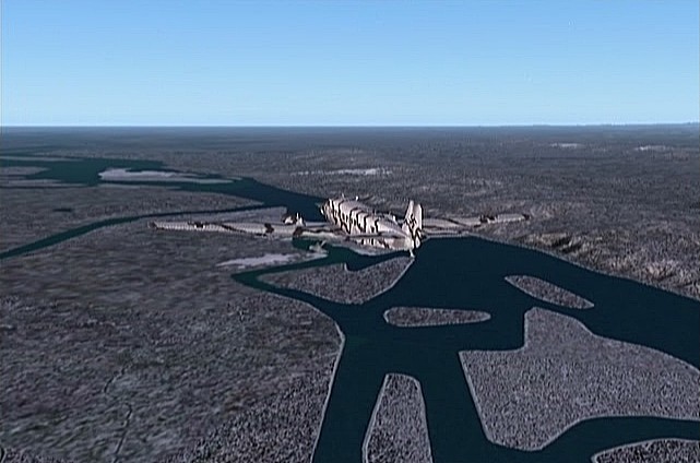 滑走路以外からの離陸は、一旦どこかの空港からスタートさせてフライトマップで緯度経度を入力する。但し、高度を正しく入力しても勝手に初速をつけられてしまうので、とんでもなく低い高度、例えば200mの高さがあっても0mに設定すると初速がつけられることもなく高度も自動的に正しく設定されるようだ。オートパイロットは便利だなあ。フライト中にもトイレに行ける。