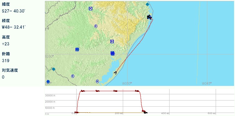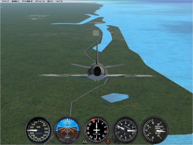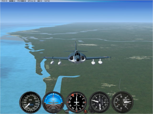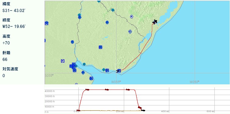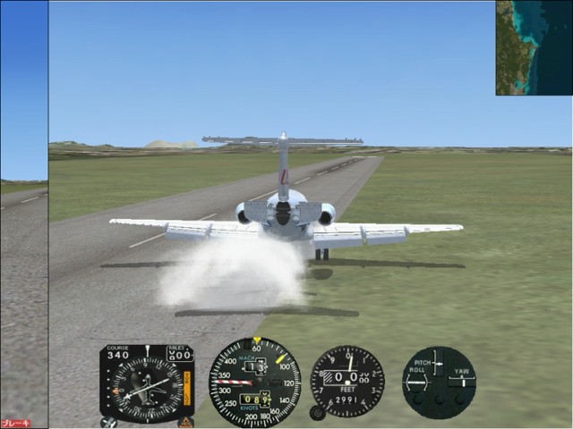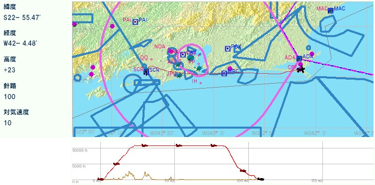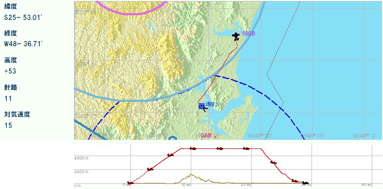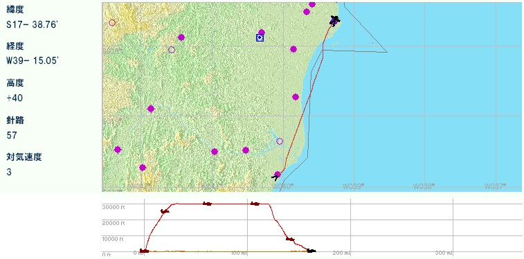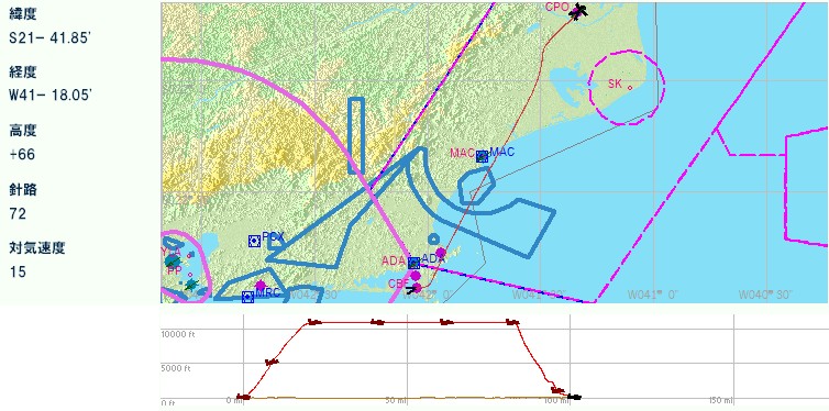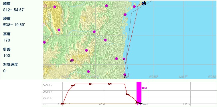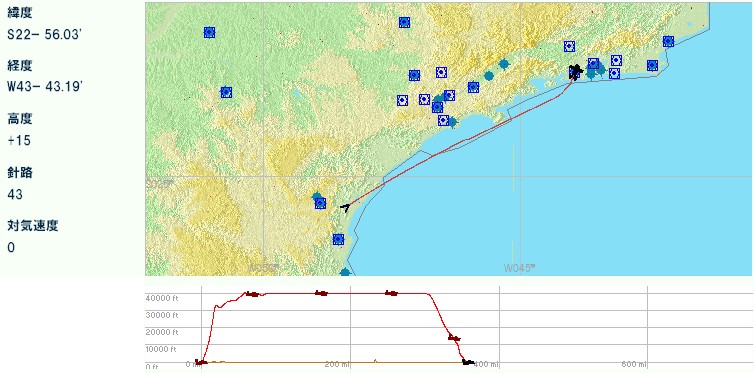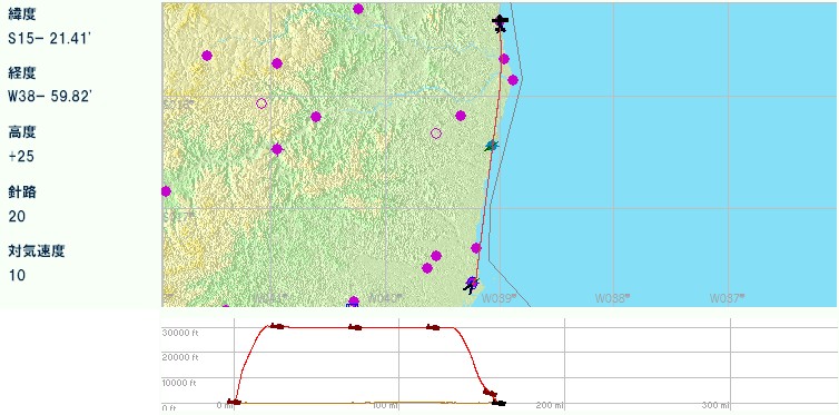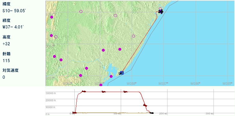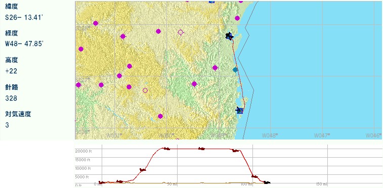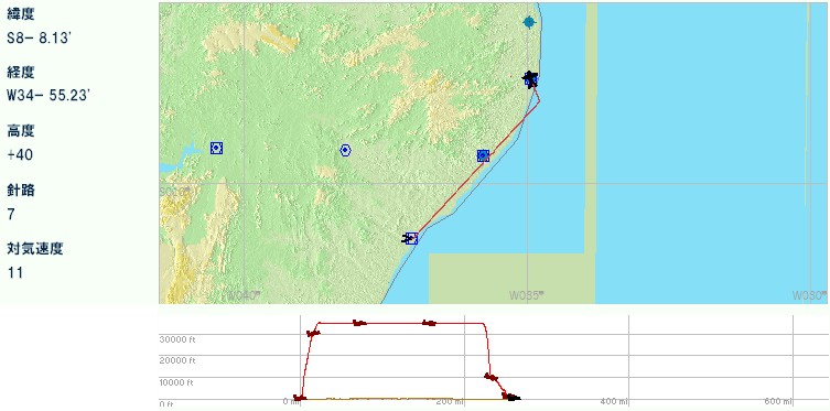 ようやくブラジル入り。近くに大きい空港がなかったので、高速機を使って距離をかせいだ。フライトが終わると大抵は次のフライトの機種を決めて1度はテストで次の空港まで飛ばすのだが、そのせいもあって数日後練習せずに本番に入ってしまう。この日も練習時間がもったいなくて、ぶっつけ本番とあいなった。そのため、到着空港をうろ覚えで「たしかこの辺だったよなぁ」。やはり着陸で練習不足が出てしまった。