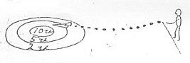 2m間隔でポールを立て、その間を通ったならば、「通過」と認める。 利点=円形方式に比べれば、「通過」の判定がはっきりしている。 欠点=「通過」せずに行き過ぎた者は、大きくまわって戻らないといけない。これをあまり繰り返す事は、ゲームをつまらなくする。どちらの方向に通っても良い事にすればこの欠点は半減するが、それでもポールの真横に落ちた時は、1回は無駄に投じなければならない。 |