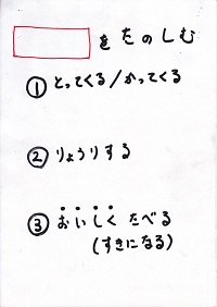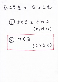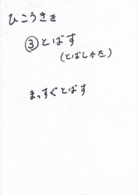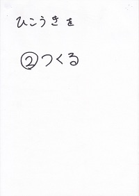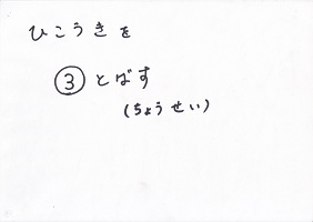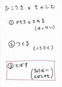 「みんな、好きな食べ物は何かな?」<失敗:調理を想定した質問だったが、「好きな食べ物」の問いに対して「メロン」「スイカ」という返事が返ってきた。「好きな給食」を問うべきだった。やむを得ず「メロン」で話を進める。>「うちでメロン作ってる人はいるかな?」 「いない。じゃあ、みんな、お店で買って来なきゃならないね。(低学年の子に)買って来れるかな?」→① 「さて、メロンは買って来た。そのまますぐ食べれるかな?」 「包丁で切らなきゃならないね。」→② 「最後に、美味しく食べる。」 「でも、もし美味しくなかったら、メロン好きになれるかな?」→③ この3つが揃わないと、1つ欠けてもメロンを「楽しむ」ことはできないね。この事を、紙飛行機について考えてみよう。 |