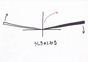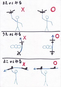 3方向から見て、いずれも「真っ直ぐ」に投げ出さなければいけない。 (真っ直ぐでない飛ばし方と真っ直ぐな飛ばし方の両方を実演してみせる。その後、子ども達に実際に飛ばさせて一人一人にコツを教える。座ったままでは子ども達も飽きてくるので、それを防ぐ意味もあった。) |