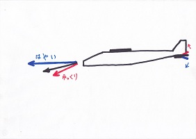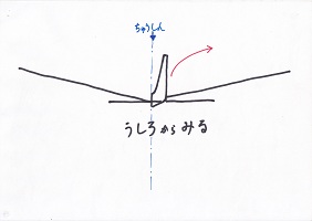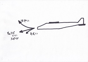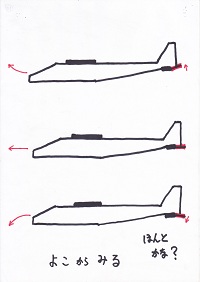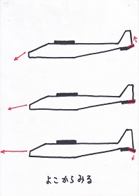 そして、真っ直ぐ飛ぶ速さより速く投げると上へ行ってしまい、遅く投げると下へ落ちてしまうんだ。 ちょっとむずかしいかな? 自分のが出来上がったら、いろいろ試して下さい。 (「縦安定」は難しいところであるが、ここの説明にこだわると子ども達は飽きる。話だけでは分かるはずもないからさっさと通り過ぎて、自分の機体を投げてみて上手くいかなかった時に「何故?」と振り返ってくれれば良い。) |