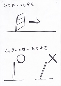 (折り目をつける時のカッターの使い方の説明と、カッターを使い慣れていないと刃を斜めにして切っている場合が多いことに対する注意。) |