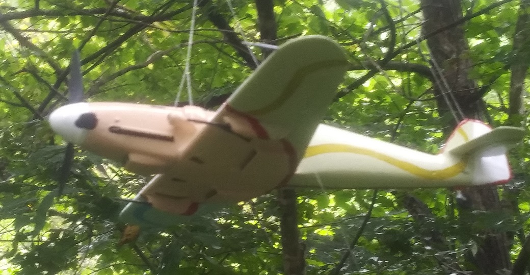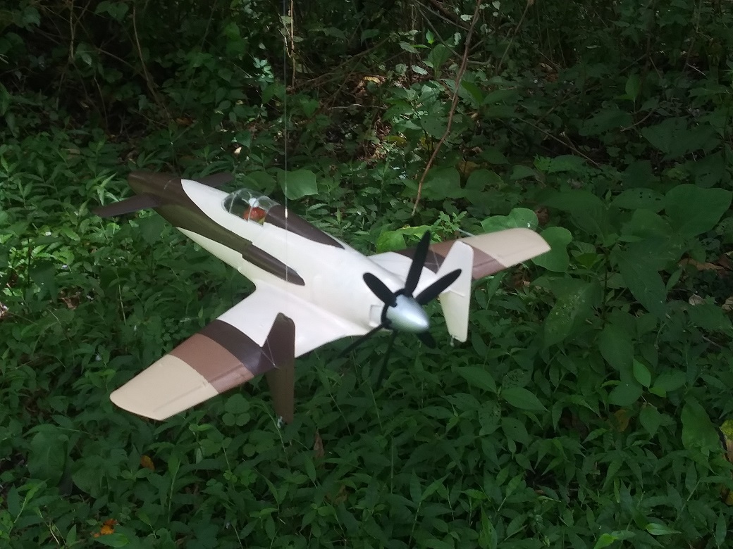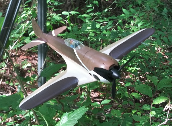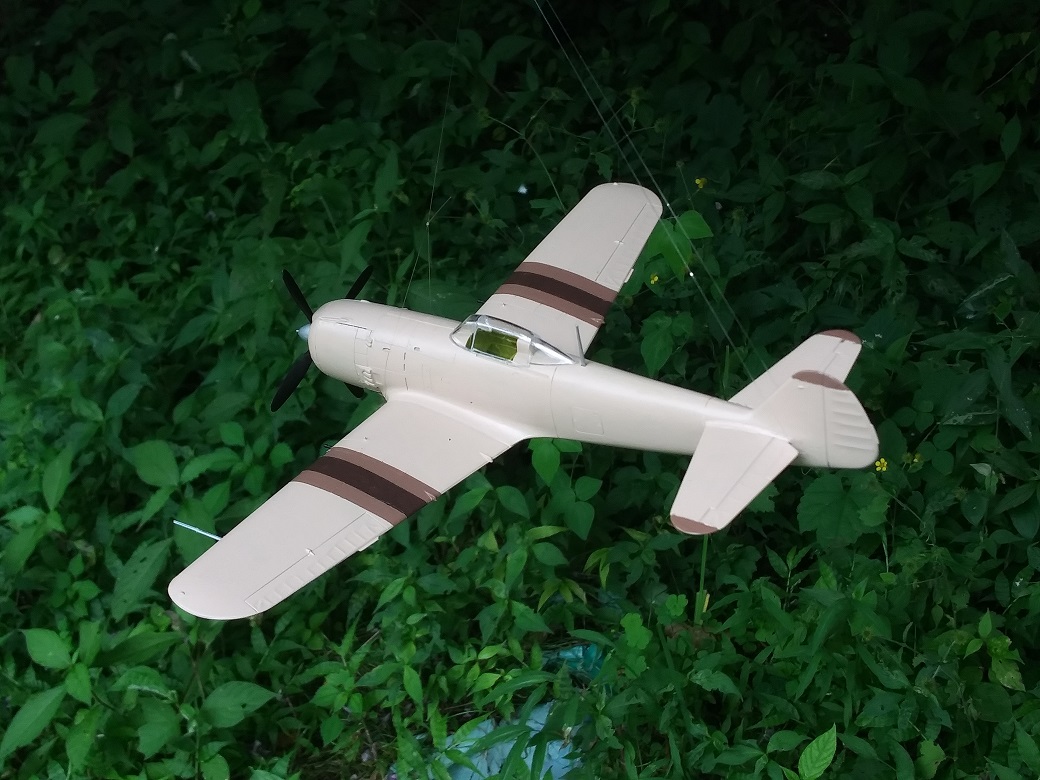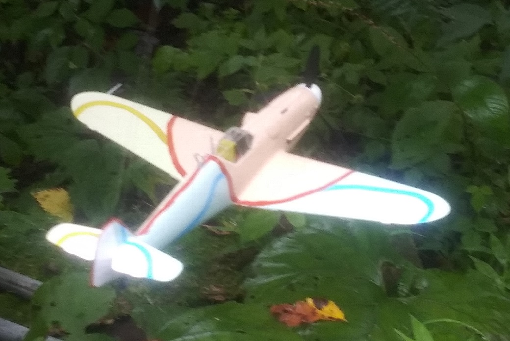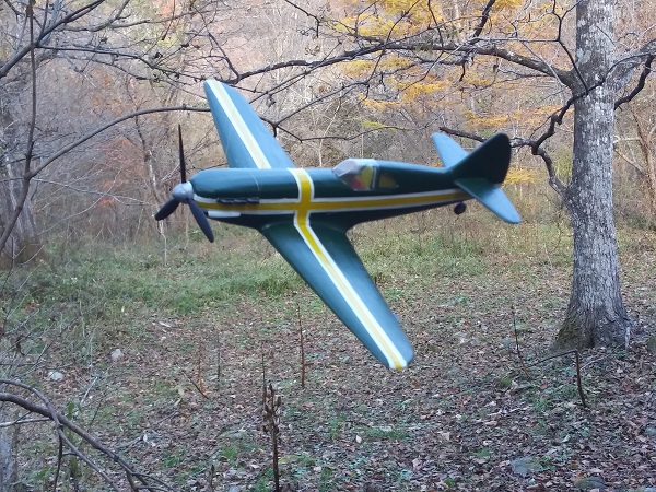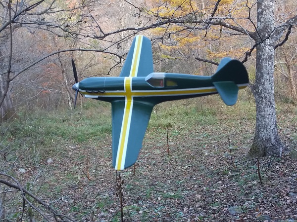 塗装は、考えていたパターンは幅広の平筆がなくて描けず、急遽その場で思いついたパターンに変更した。スピナーの黄色は考えていたが、塗ってみるとけっこうインパクトがあって、これもその場の思いつきで胴体にも黄色でアクセントをつけた。行き当たりばったりにしては満足な仕上がりになった。