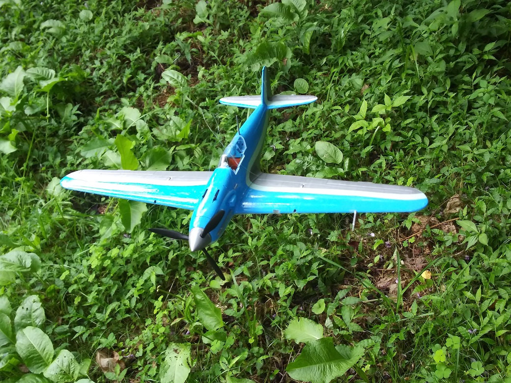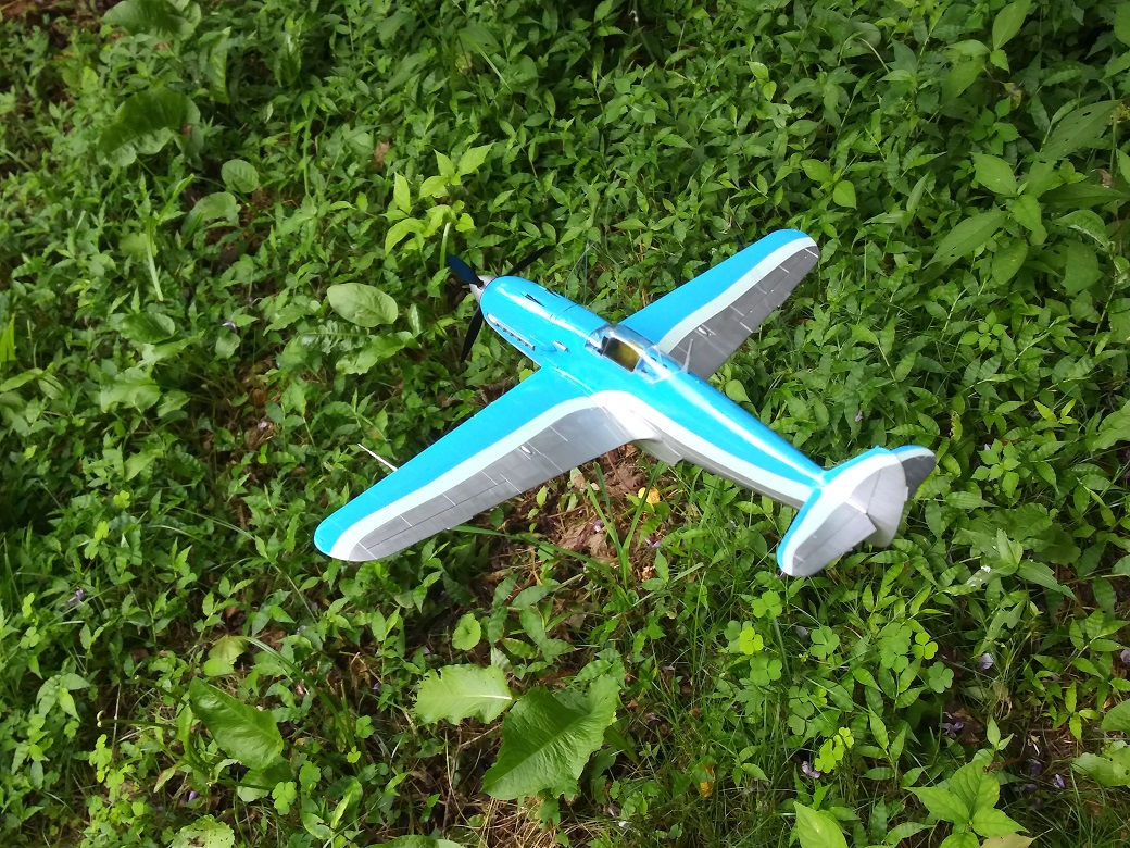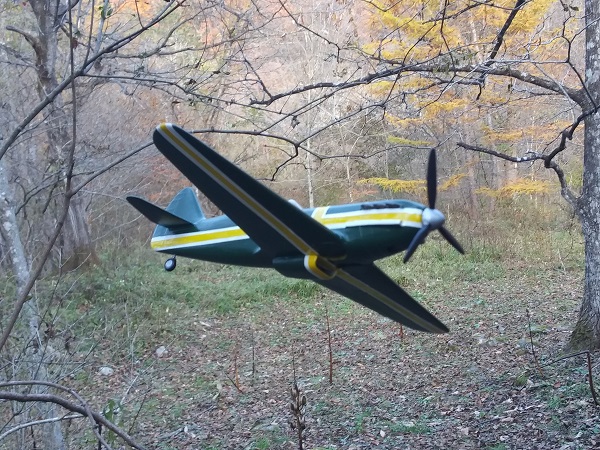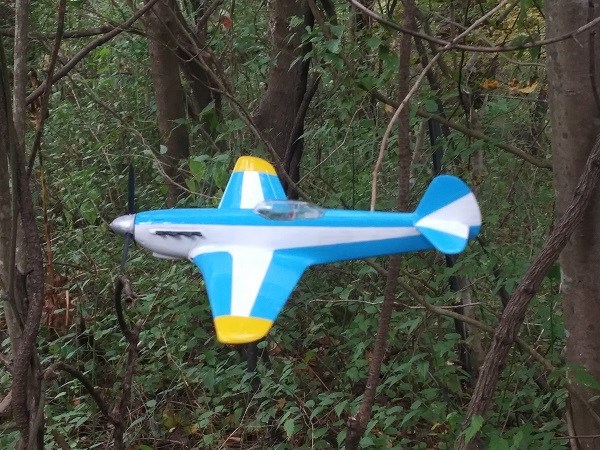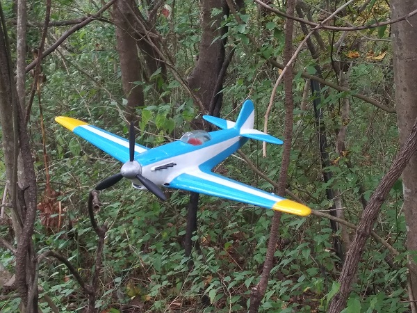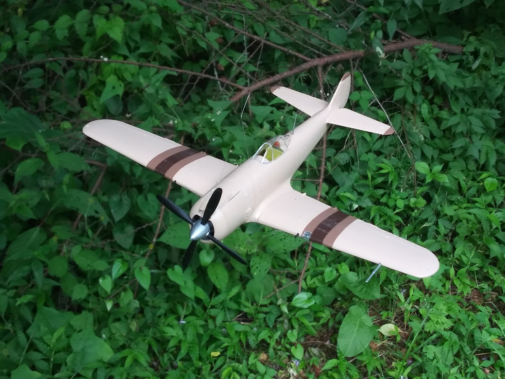 塗装は、考えていたパターンは幅広の平筆がなくて描けず、急遽その場で思いついたパターンに変更した。スピナーの黄色は考えていたが、塗ってみるとけっこうインパクトがあって、これもその場の思いつきで胴体にも黄色でアクセントをつけた。行き当たりばったりにしては満足な仕上がりになった。