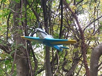 久しぶりの製作。ペイントのアイデアが出てこないと、なかなか製作に取りかかれない。今回は、飛燕を目の前にして濃い青と白ですっきりしたコントラストのイメージが思い浮かんだ。おそらく過去の飛燕のイメージにはなかったろう。当初、上面は白を基調に青のライン、下面は逆に青を基調に白のラインを考えていたのであるが、ラインというのはマスキング・テープなどでくっきりした機械的なイメージになるので、もっとぼんやりした生物的イメージにしたいと、筆跡が見える塗装に切り替えた。首から上が白い鷲のようなイメージである。ただ、出来上がりはパッとせず満足はできていない。