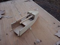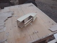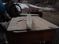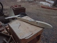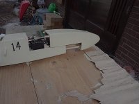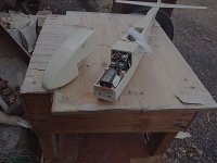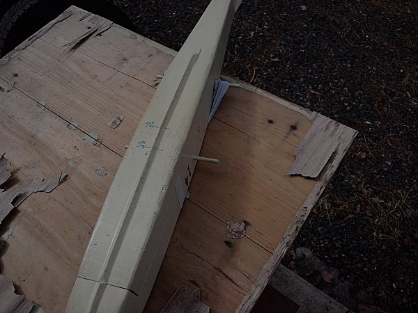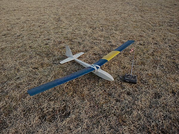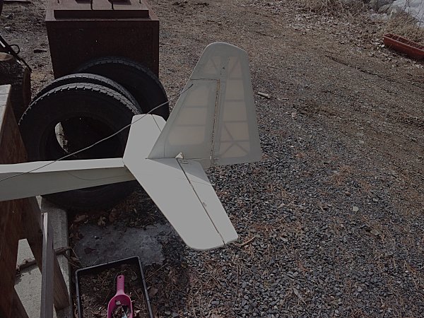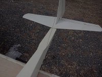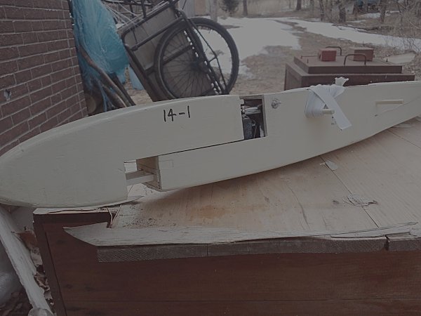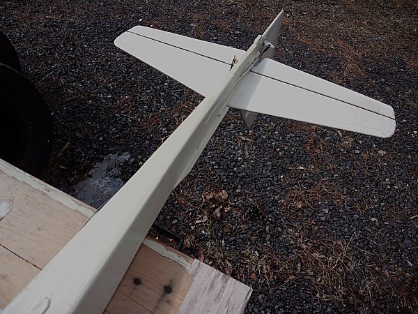 胴体は、新機計画(2014.11.)以前に作りかけていたものを流用した。この胴体は、純グライダーのほかに電動モーターやカメラ搭載ができるようそれぞれのパーツを取り付けたノーズユニット方式になっている。即ち、カメラ機の場合はカメラを載せたユニットを、モーターグライダーの場合は電動ペラやバッテリーを積んだユニットを、純グライダーの場合はカラのユニットを取り付けて飛行させるのである。その第一段階として、純グライダー用のカラのユニットで完成させた。ユニットの固定はとりあえずビニールテープで行なっているが、1本のビスで止めるようにする予定。ユニット分割点から胴体後尾まで900mm(バルサ長)としたため、胴体No.4と比べて胴体長は100mm伸びた。また、バードマン機を製作した時の余り材料に2mm樺ベニヤがあったので胴体側面前半の内張りにふんだんに使い、非常に頑丈な胴体に仕上がった。外装は、フィルムがなかったのでアクリルペイントを刷毛塗りした。