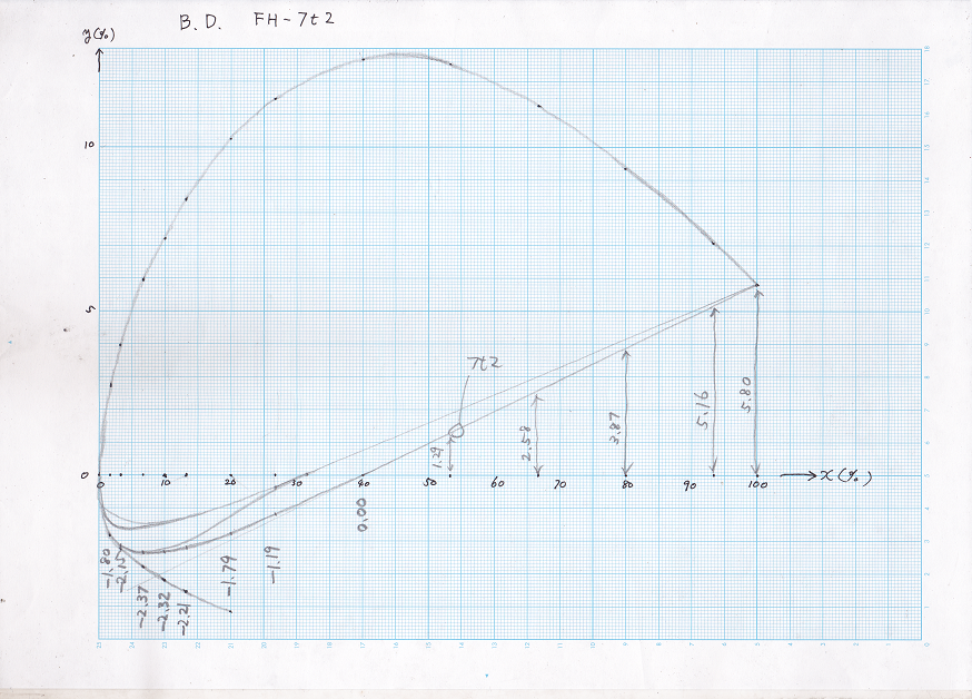 x=60%を基点としてx=100%で後縁厚になるような2次曲線を考え、これを増減量として加えることで後縁厚を調整する。この方法は、リブ設計ソフトでも用いられており、リブ設計を行なう時に同じ条件を指定すれば元のB.D. FH-7(B.2)が得られる。