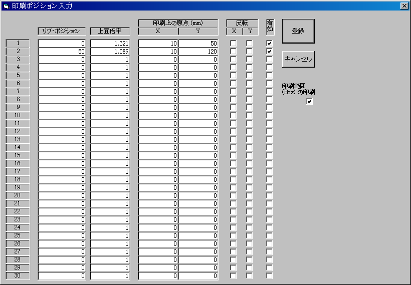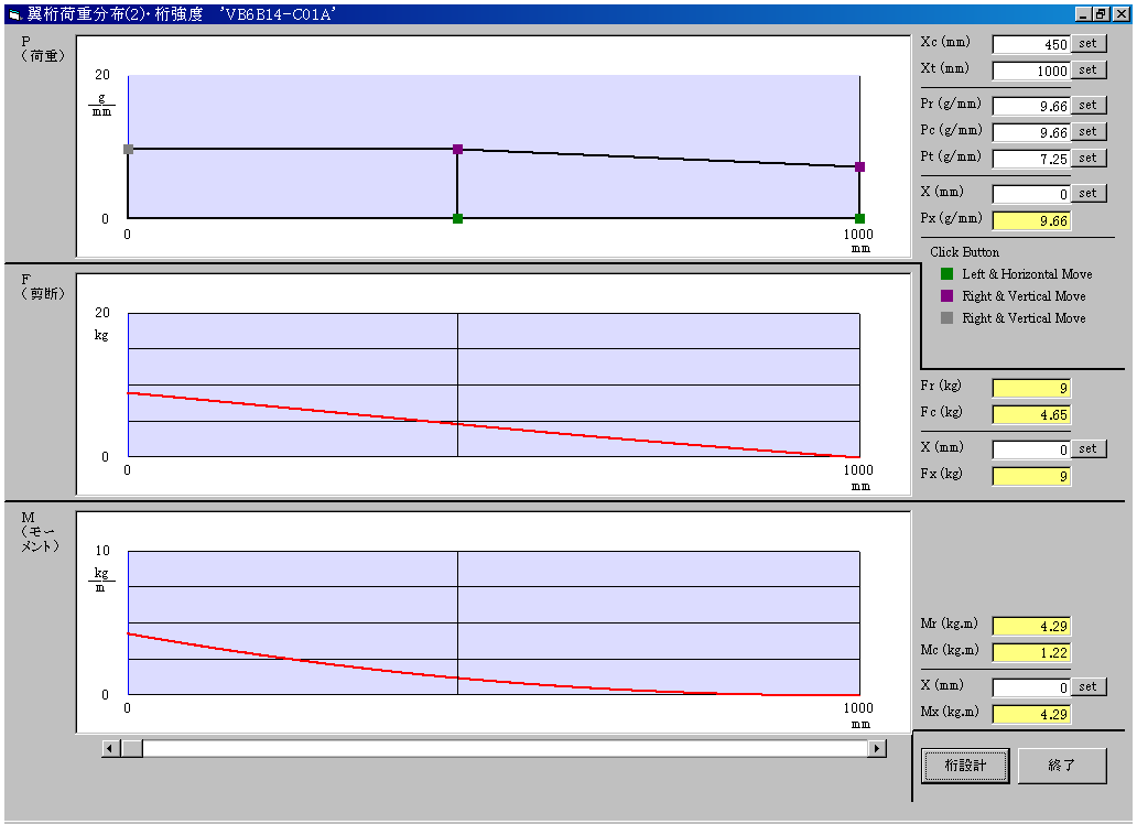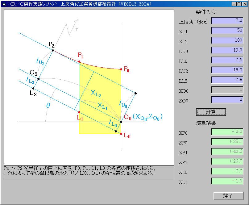 x (%) yu (%) yl (%) 30.000 9.500 - 3.800 次に、上反角付主翼翼根部桁設計ソフト (VB6B13-302A) を用いて、リブ・ポジョション 0, 50 mm 位置の翼型座標倍率を求める。