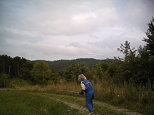 「鳥」のラジコン・グライダーを製作している秋田の高橋正喜氏(ラジコン・グライダーのページに紹介)が、盆休みを利用して十数年ぶりに会いに来てくれました。現在「鳥」は一羽も持っていないそうで、手投げグライダーを持って来て飛ばせて見せてくれました。久慈近辺はスロープ・ソアリングができる場所はなく、サーマルのできそうな小規模な場所がいくつかあるだけなので、私がメインに使っている場所を案内しました。機体は200g弱と弱いサーマルしかつかめないこのあたりで飛ばすにはうらやましい機体でしたが、あきらめずに何度も投げる根気とかすかなサーマルをつかみながらの粘りのフライトはさすがでありました。