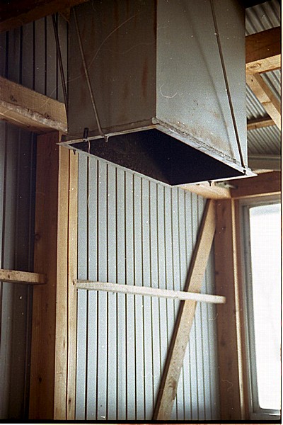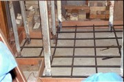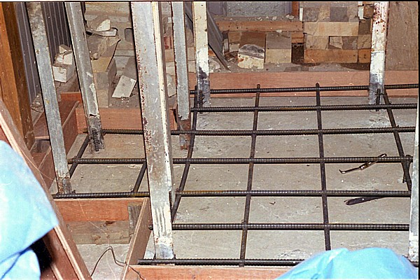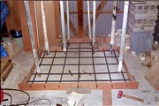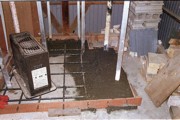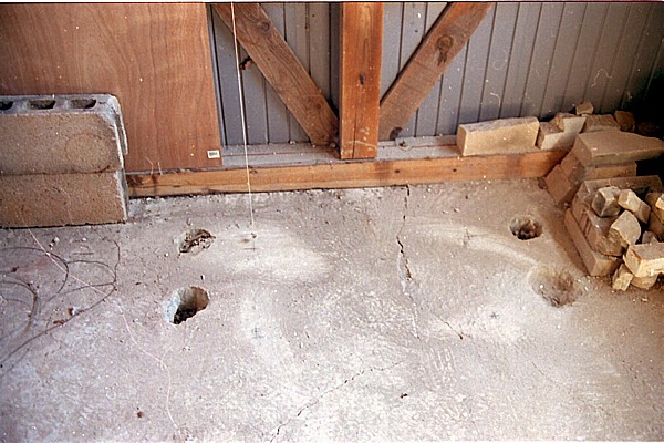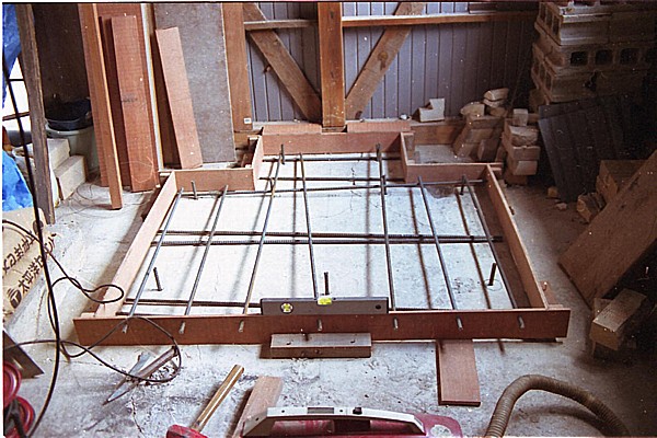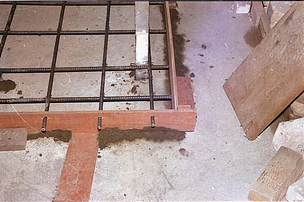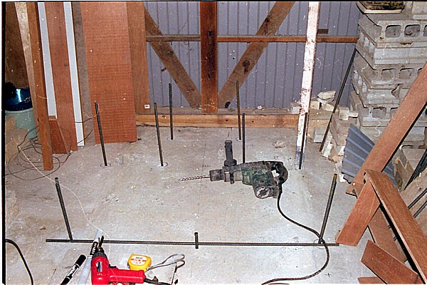 土台コンクリを床に固定させるための鉄筋を立てる。鉄筋孔の 深さはドリル刃の長さいっぱい、16cm。中央前方の1本以外には、窯と煙突の四隅を決める8本のLアングルが結束線で固定される。Lアングルを床コンクリまでつき通さなかったのは、将来より大きな窯に作り換えることになった場合、土台コンクリを大きく壊さなくてもアングルを抜けるようにするためである。