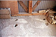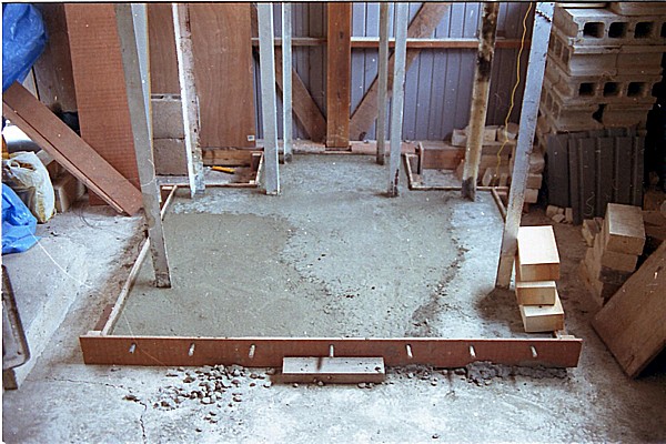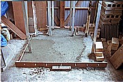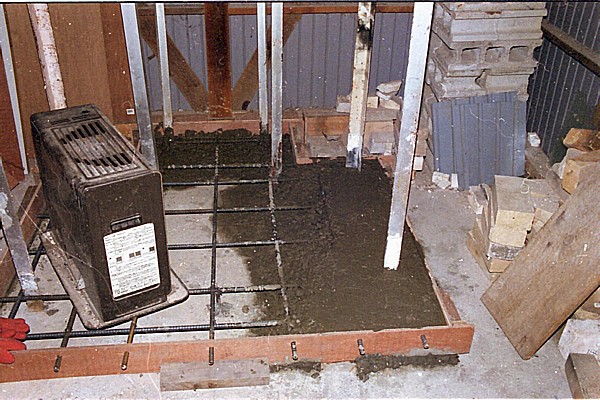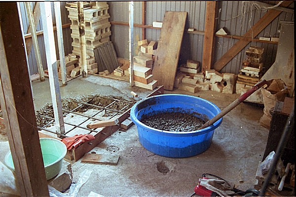 3月18日、大タライを使ってコンクリを練り、流し込み作業開始。買って来た砂2袋+砂利4袋で全体の約1/4が完了。配合比はセメント:砂2:砂利=1:2:4の大強度用。