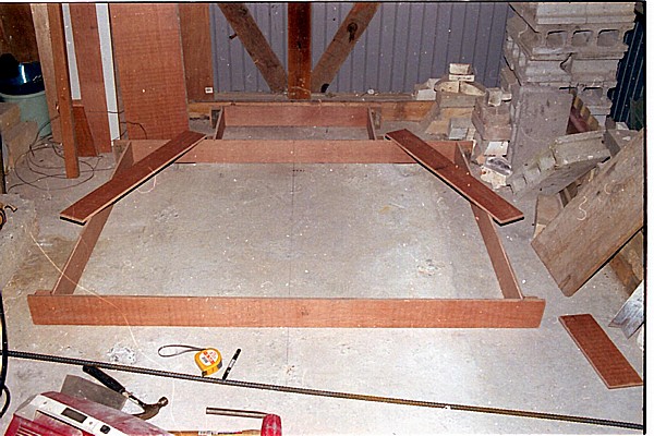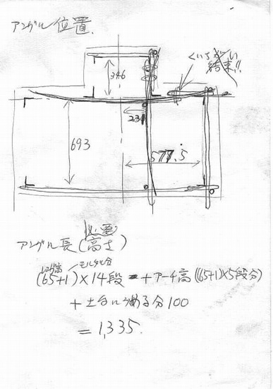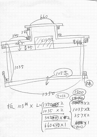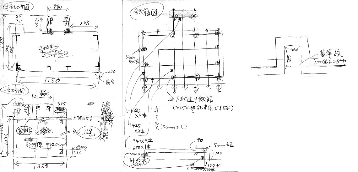 3月14日、土台コンクリ枠を置く位置を決定するための設計図を描き、枠を完成させる。