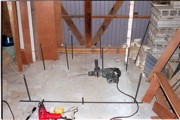 3月15日、アングルを立てる位置を決め、ハンマードリルをリースから借りてきて鉄筋孔をあける。