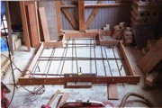 鉄筋をグラインダで長さに切り、枠の水平方向を固定して鉄筋を置いてみた。床コンクリの水平が取れておらず、立てた鉄筋を先に8cmで切ってしまったのは失敗。枠の水平を取ろうとしたところで、本日の作業打ちきり。