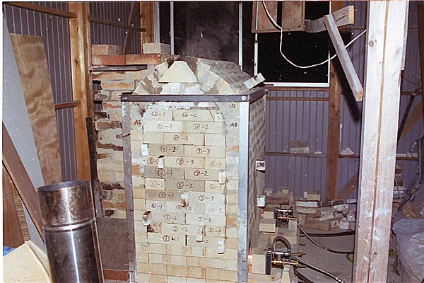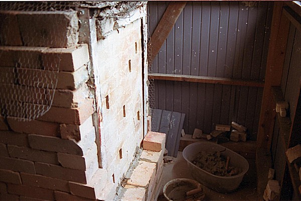 1)外壁の断熱構造:前・後壁の断熱レンガを、右壁のように耐火土を間に挟んで再積上げ。