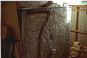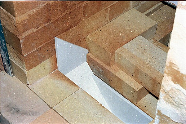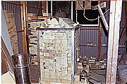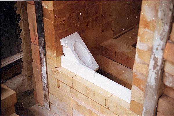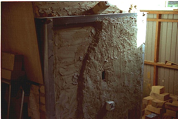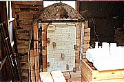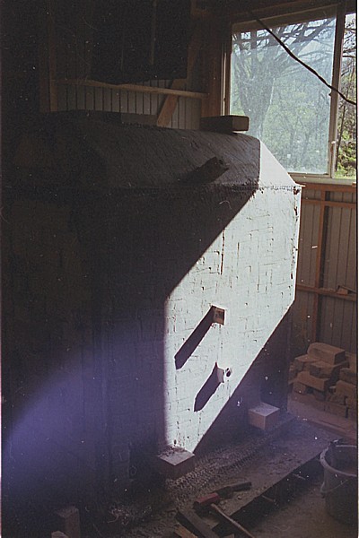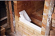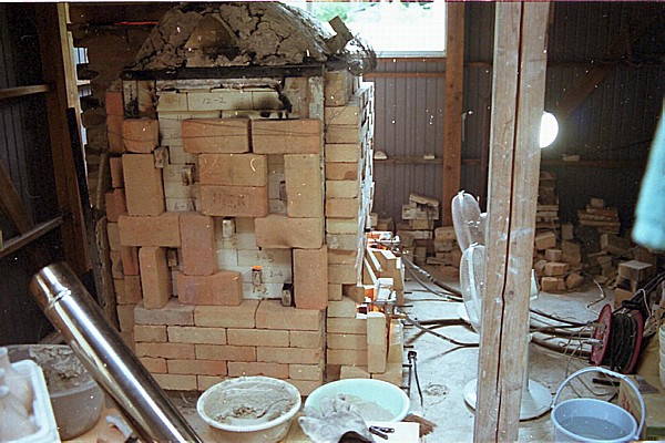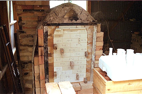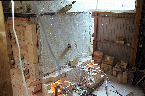 5)アーチ上部の断熱:焼成のたびに耐火土を盛り上げている。しばらくこの作業を続ける。(乾燥収縮が大きいので、一度に盛らず、少しずつ何回も塗り付ける方法をとっている。)最後の回には盛った土が剥がれ落ちないよう、金網をかぶせてその上にひと塗りして完成となる。