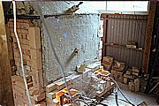 6)煙突の完成:現在、最上部の5段はB−1レンガを仮置きしているだけなので、中古の耐火レンガで積み直してモルタル固定する。また、地震で崩れないよう、アングルで囲って、アームで小屋の梁に固定する。(そろそろ大きな地震が来そうな気がする。)