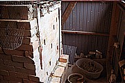 7)煙突背部の断熱:煙突部と小屋の壁が近く、煙突の熱で柱がかなり熱くなるので、間に波板鉄板を浮かせて固定する。