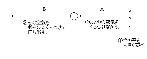 ③打球の瞬間に、平手の上側(指)が軽くかぶさるように触れると